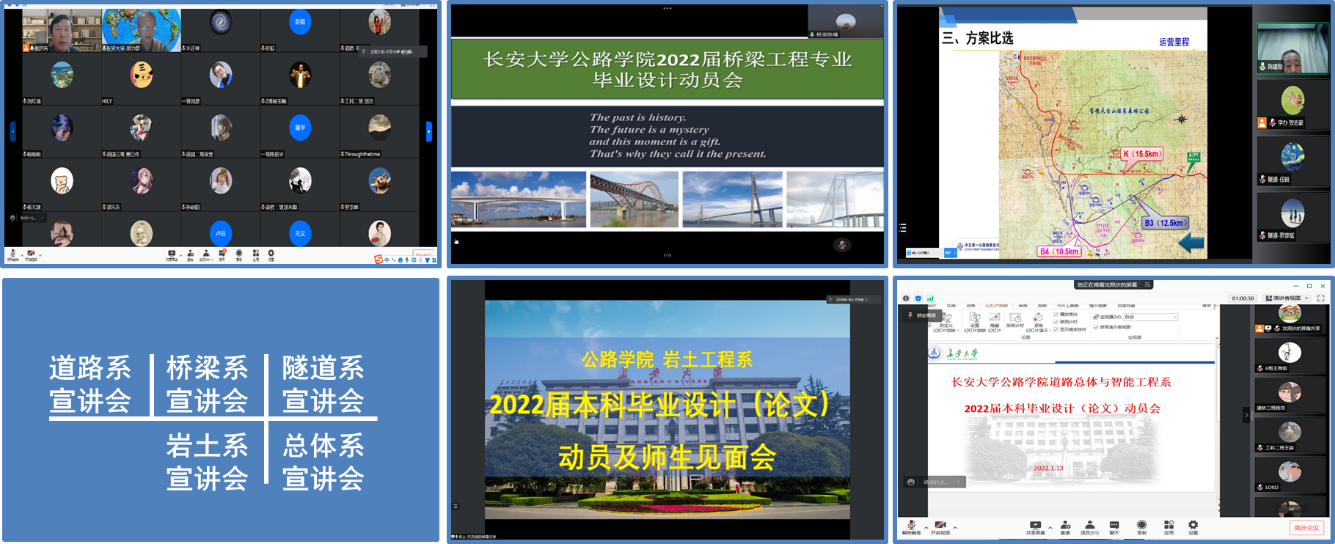 为进一步加强本科毕业设计过程管理,全面提高人才培养质量,2022年1月13日晚7时,学院召开道路桥梁与渡河工程专业2022届本科毕业设计线上动员会。学院院长陈建勋、副院长张久鹏、各系主任和本科教学副主任,150名指导老师和478名道路桥梁与渡河工程专业2018级学生参加动员会。线上动员会分全体动员会、各专业方向宣讲会两个阶段,由张久鹏和各系主任分别主持。