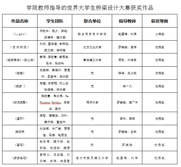 桥梁工程系赵国辉副教授指导的作品《Light》获得二等奖,赵国辉获“优秀指导教师奖”,桥梁工程系罗晓瑜、陈峰、宋一凡等教师指导的5项作品获优秀奖、3项作品获入围奖。
