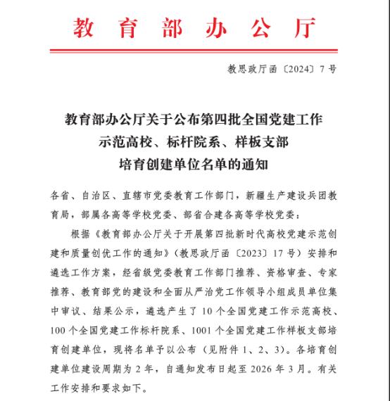 4月16日,教育部思想政治工作司发布《教育部办公厅关于公布第四批全国党建工作示范高校、标杆院系、样板支部培育创建单位名单的通知》(教思政厅函〔2024〕7号),经省级党委教育工作部门推荐、资格审查、专家推荐、教育部党的建设和全面从严治党工作领导小组成员单位集中审议、结果公示,遴选产生了10个全国党建工作示范高校、100个全国党建工作标杆院系、1001个全国党建工作样板支部培育创建单位。麦田影院