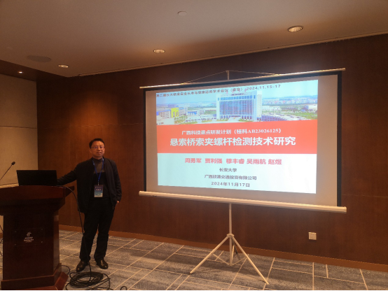 周勇军教授作了题为“悬索桥索夹螺杆检测技术研究”的报告,系统介绍了考虑多因素影响的索夹螺杆紧固力损伤预测模型、悬索桥索夹螺杆紧固力损失的机理和规律,以及螺杆紧固力的智能检测与补张一体化技术。两位老师的精彩报告得到了与会专家的一致好评和高度认可。