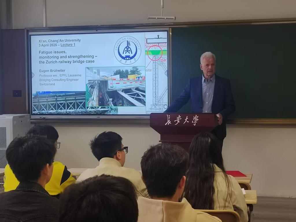 4月3日Brühwiler教授做了题为“Fatigue issues, monitoring and strengthening – the Zurich railway bridge case”和“UHPFRC for the improvement of reinforced concrete bridges”的2场学术报告。桥梁系教师和近40名研究生聆听了学术讲座,参会师生就钢桥加固新技术、UHPFRC组合结构桥梁研究与实践新进展等,与Brühwiler教授进行了深入探讨和交流。来访期间,Brühwiler教授与麦田影院