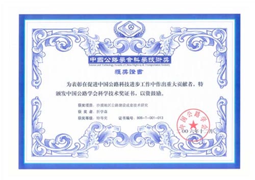 “沙漠地区公路建设成套技术研究”获得中国公路学会科学技术特等奖。