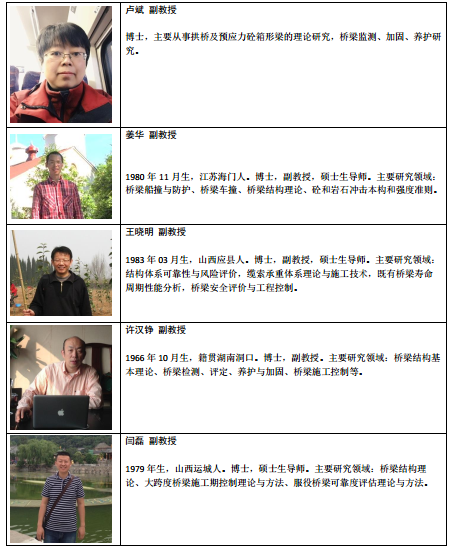 桥梁与隧道学科招收学术型与专业行硕士研究生,学制均为3年,其中,桥梁方向开设弹塑性力学、结构工程数值方法、桥梁结构理论、混凝土结构理论、结构可靠度、结构动力学、结构稳定理论、结构疲劳与断裂、桥梁模型试验、桥梁风振与振动控制、桥梁地震动与减隔震、桥梁结构非线性与仿真、桥梁监控与健康监测、桥梁结构防灾与减灾、桥梁评定与加固方法、桥梁概念设计、桥梁工程发展趋势等专业课程。开设以下研究方向: