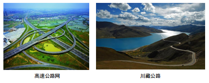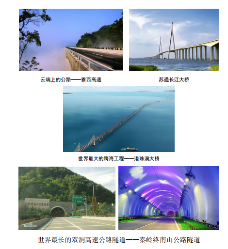 2012年4月,雅(安)西(昌)高速公路建成通车,整条高速公路跨越崇山峻岭,如同行驶在天际一般,被称为“云端上的公路”; 2016年9月,世界最大的跨海工程——港珠澳大桥桥梁主体全面贯通,将珠海、香港、澳门紧密联系,22.9公里巨龙横亘伶仃洋,“中国结”熠熠生辉,“海豚”塔栩栩如生,“风帆”塔扬帆矗立,成为中国从桥梁大国走向桥梁强国的里程碑之作;2007年1月,世界最长的高速公路隧道——秦岭终南山公路隧道通车,至此秦岭天堑变为通途,横穿秦岭山脉仅需15分钟,朝霞、晚霞、蓝天、白云等人性化的灯光设计,给人一种在隧道间进入蓝天日出的山谷间的美妙感觉。