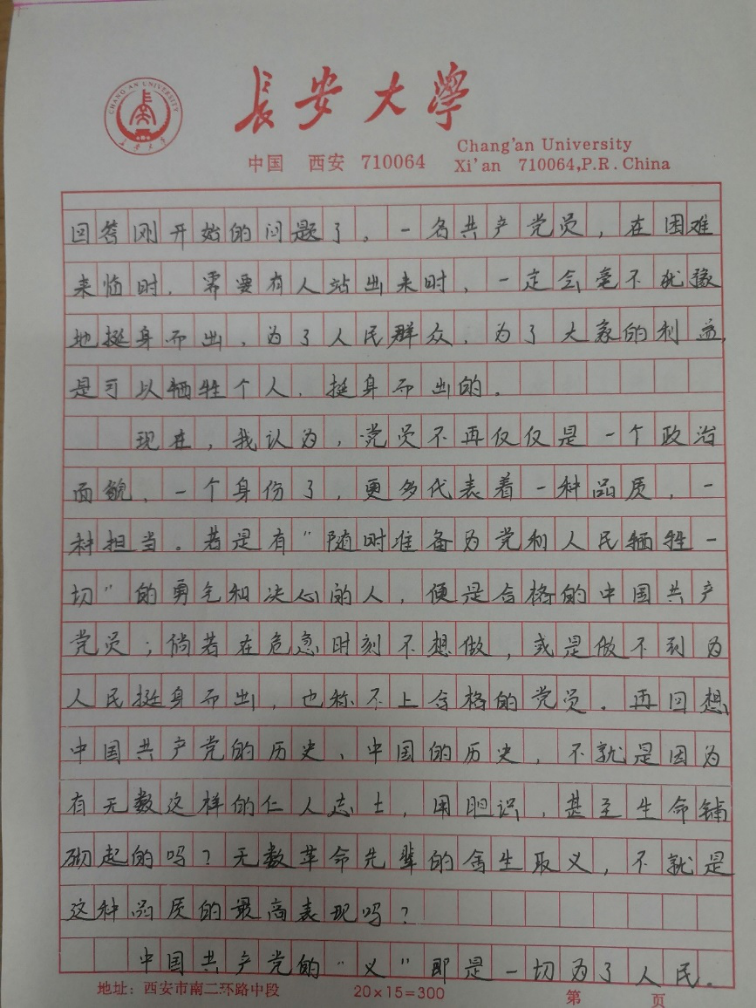 本科生第五党支部正式党员王蕾在思想汇报中明确表示:“敢于奉献,勇于奉献,甘于奉献”不是在口号中喊出的誓言,更是落实到行动中的责任与担当,我们也要成长为最勇敢的一代,守护好祖国母亲。