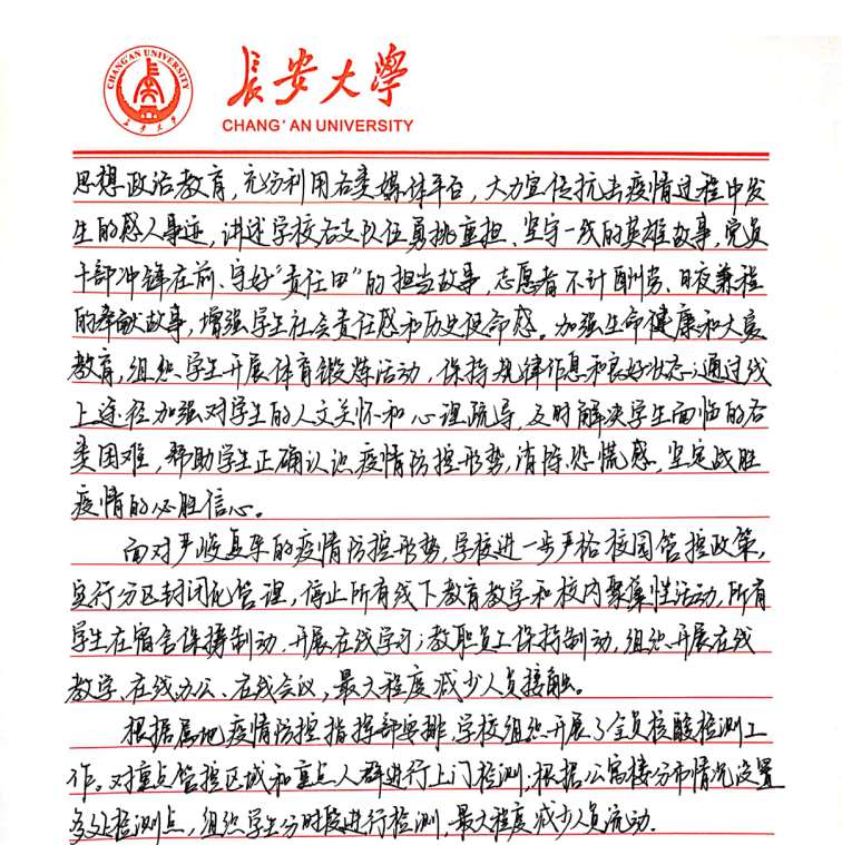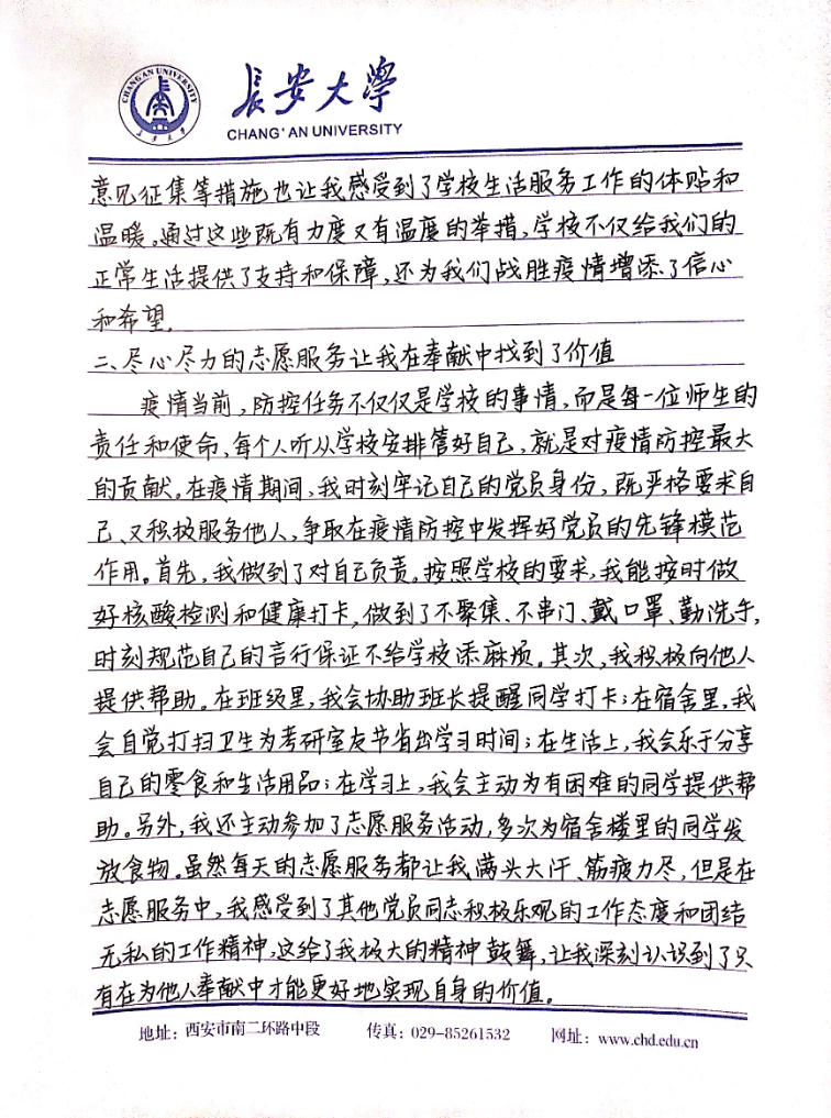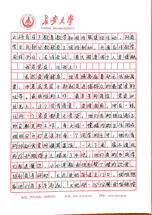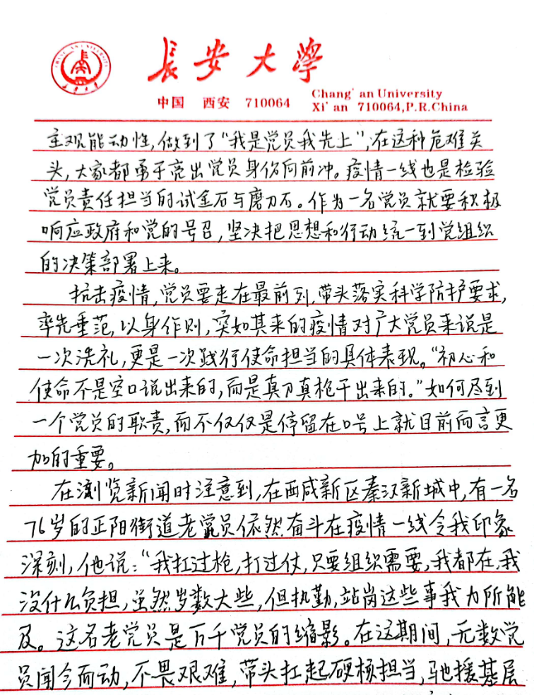 本科生第四党支部正式党员刘铮在思想汇报里表达了对学校的感激和赞扬:面对严峻复杂的疫情,我校严格的校园管控政策,充分保证了全校师生员工的生命健康和安全,最大程度保证日常生活学习,精确做好各项服务保障工作。坚信我们一定可以打赢疫情防控阻击战。