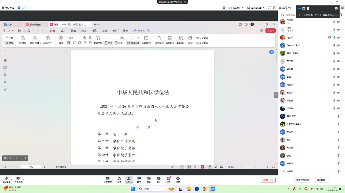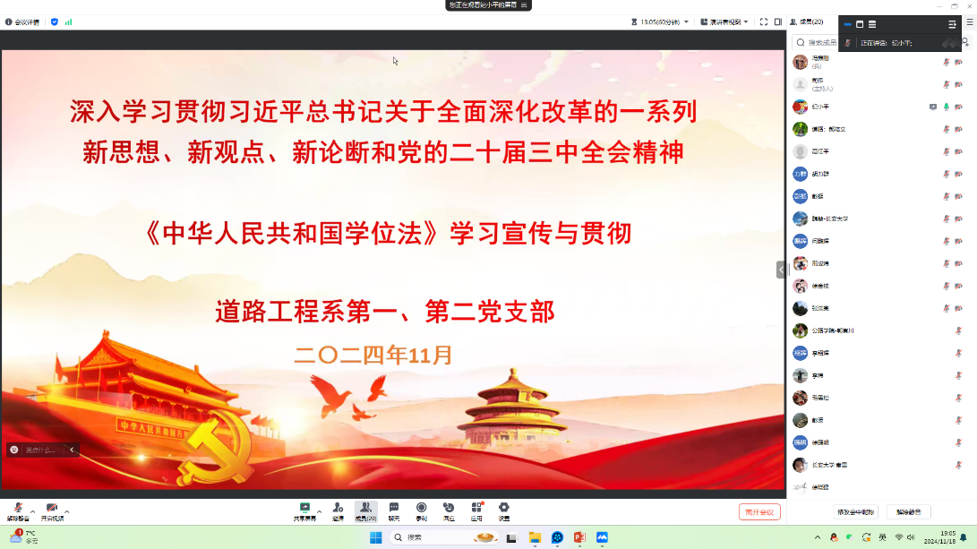 2024年11月18日晚,道路工程系第一、第二党支部在线上学习贯彻党的二十届三中全会精神及《中华人民共和国学位法》。